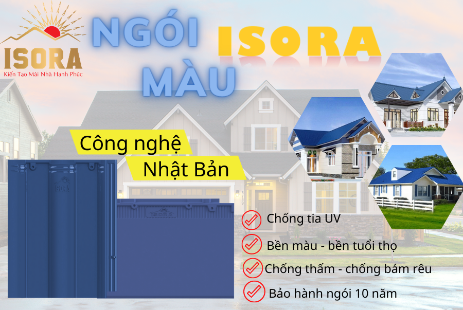 Ngói màu ISORA là dòng ngói xi măng được sản xuất theo công nghệ ép khô trên dây chuyền thiết bị đồng bộ hiện đại nhất thế giới của Nhật Bản. Kĩ thuật phun sơn nano giúp ngói bền màu, chỗng bám rêu hiệu quả