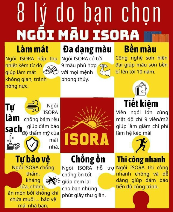 • Ngói màu ISORA là dòng ngói xi măng màu được sản xuất theo công nghệ ép khô trên dây chuyền thiết bị đồng bộ hiện đại nhất thế giới của Nhật Bản. Với những tính năng vượt trội so với những vật liệu lợp khác: nhẹ hơn tới 20%, cường độ uốn tăng 30%, độ hút nước thấp hơn 10 lần, không rêu mốc, khả năng chống nóng – chống thấm – chống ồn, chi phí rẻ hơn 20%