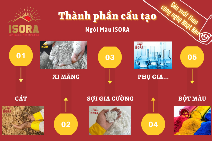 • Ngói màu đỏ cam ISORA được cấu tạo từ các loại vật liệu đặc biệt đã được nghiên cứu để nhiệt đới bao gồm các thành phần hóa sợi gia cường, cát, keo, phụ gia… nhằm đảm bảo cho sản phẩm có khả năng chống chọi một cách xuất sắc với các điều kiện khí hậu đặc trưng của Việt Nam: nóng, ẩm, mưa nhiều, gió bão.