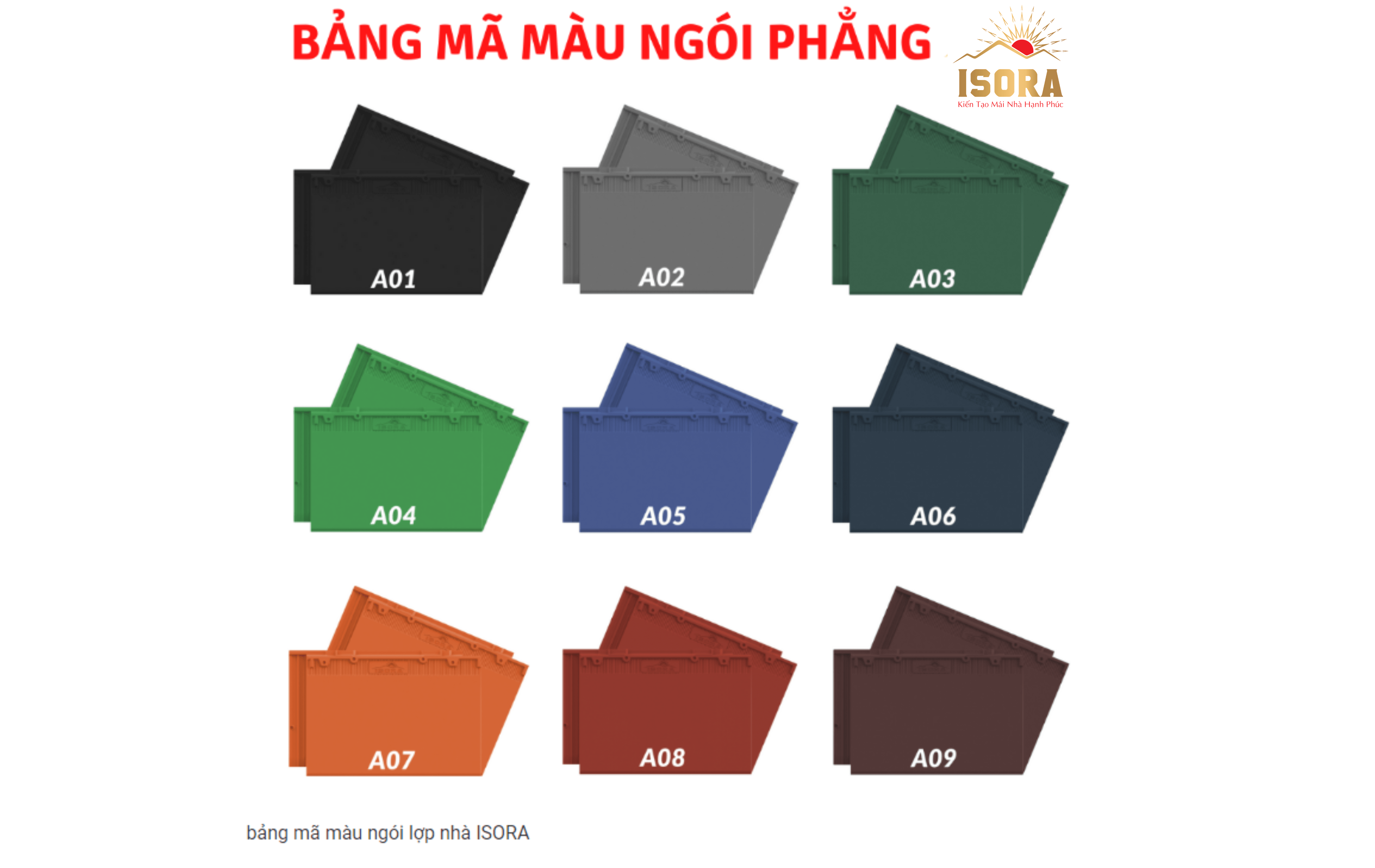 ISORA có đến 9 màu khác nhau cho hai lại ngói phẳng và ngói sóng ISORA phù hợp phong thủy đối với tất cả các gia chủ thuộc một trong năm mệnh Kim, Mộc, Thủy, Hỏa, Thổ.