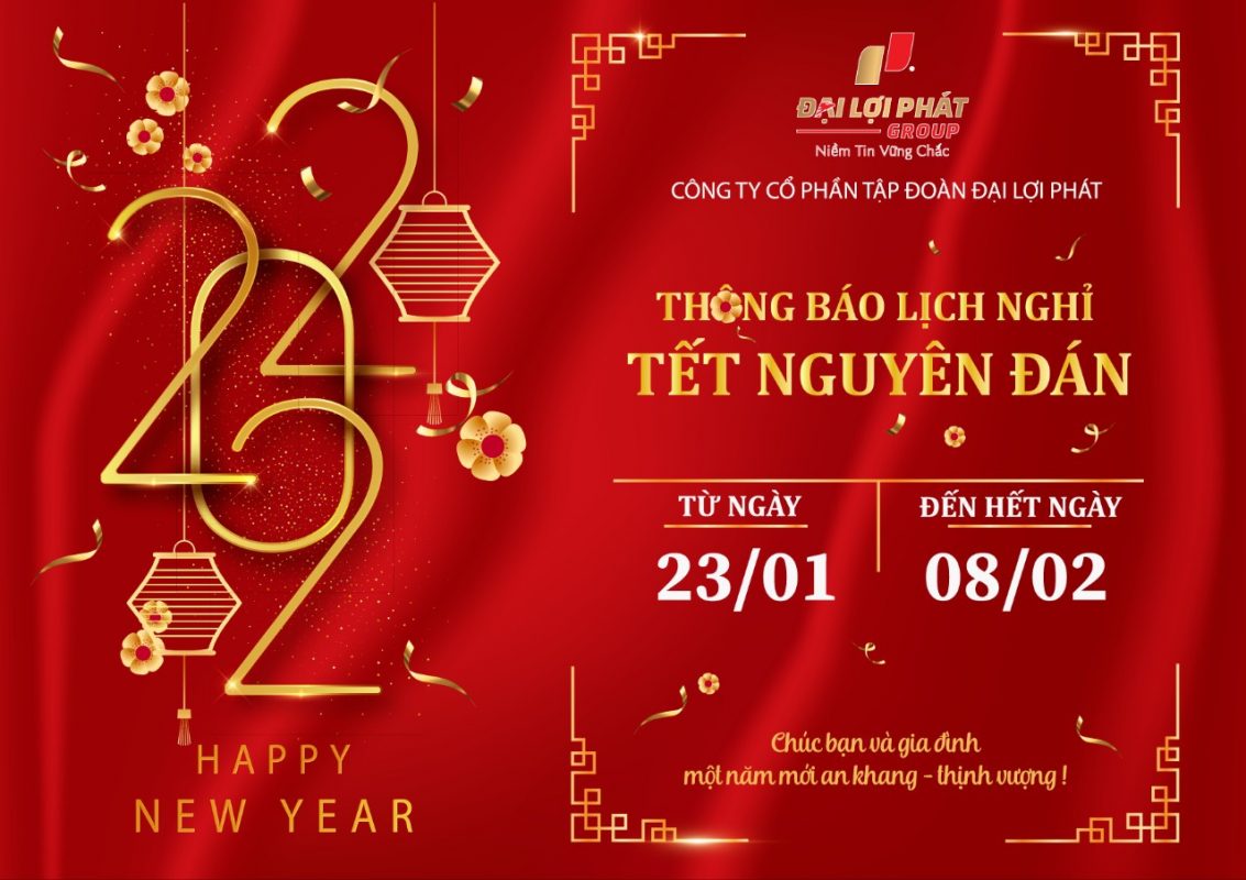 Công ty Cổ Phần Tập Đoàn Đại Lợi Phát chính thức nghỉ Tết Nguyên Đán Nhâm Dần 2022 từ ngày 23/01/2022 (nhầm ngày 21/12 âm lịch) đến hết ngày 08/2/2022 (nhầm ngày 08/01 âm lịch). Bắt đầu làm việc trở lại vào ngày 09/02/2022 (nhầm ngày 09/01 âm lịch).